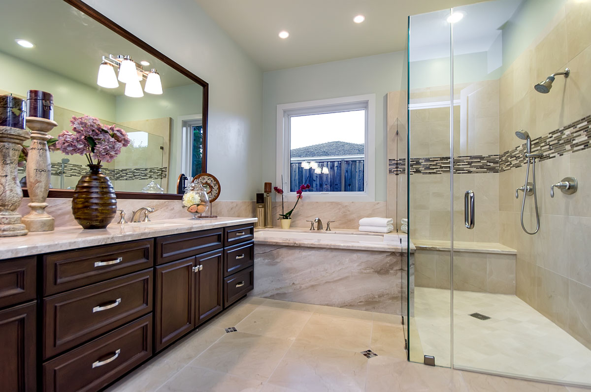 Master Bathroom-- All surfaces ar Marfil Marble with heated floors and brushed nickel fixtures.