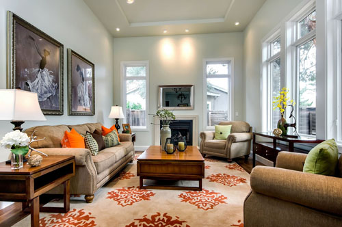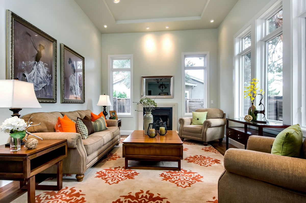 Living Room-- A formal setting with fireplace, walnut floors, coffered ceilings, recessed lighting and lots of windows for natural light.