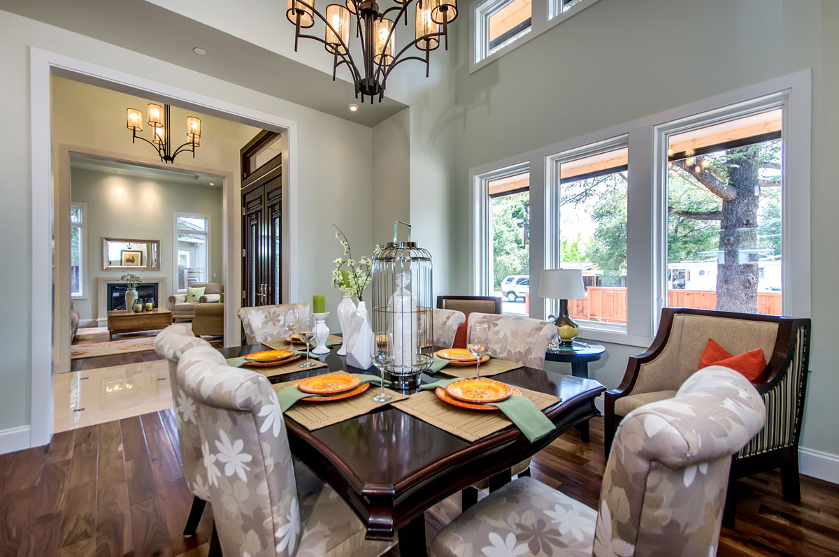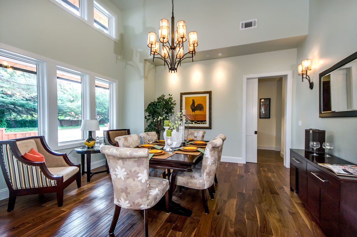 Dining Room-- High ceilings highlighting imaginative window architecture with recessed lighting, chandelier and walnut floors.
